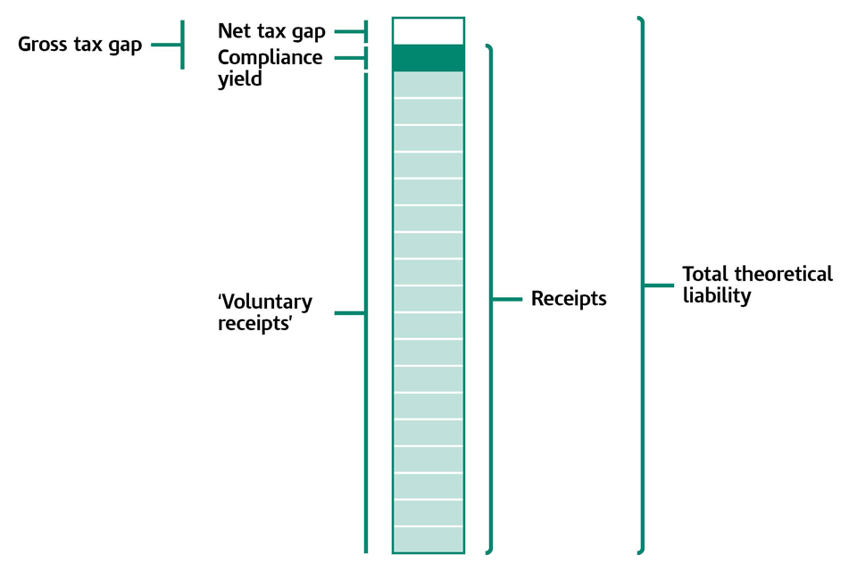 HMRC’s tax gap estimates the amount of tax unpaid after accounting for ‘voluntary receipts’ (receipts from taxpayers who get their tax right first time) and compliance yield (the additional tax receipts from taxpayers after HMRC’s activities to tackle non-compliance). This is illustrated in Figure 2 below.