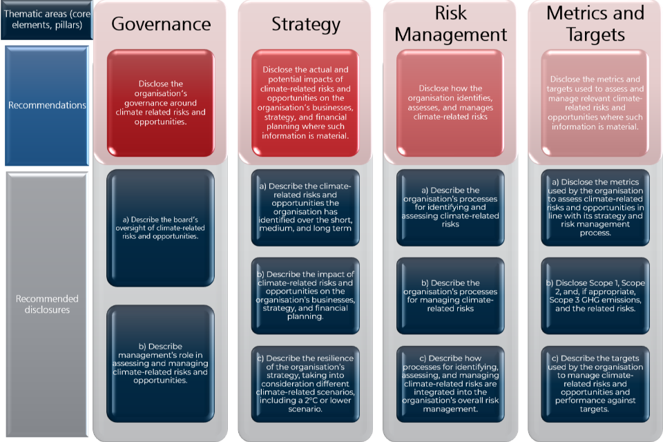 | Thematic areas (core elements, pillars) | Governance | Strategy | Risk Management | Metrics and Targets |