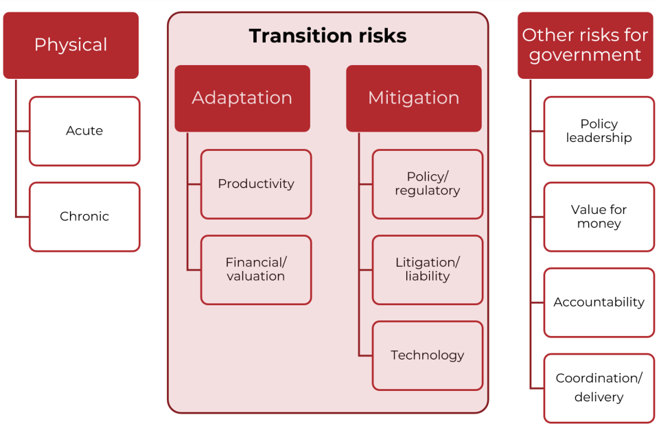 | Transition Risks | Amount and extent of assets or organisational activities vulnerable to transition risks* | Amount or percentage | Disclosure of the amount and extent of an organisation’s assets or business activities vulnerable to climate-related transition risks allows users to better understand potential financial exposure regarding such issues as possible impairment or stranding of assets, effects on the value of assets and liabilities, and changes in demand for products or services. | The responsibilities and structures for asset ownership, control and management may differ from the private sector, extending beyond the direct remit of financial reporting. Further guidance on asset management is included in MPM. Reporting entities are encouraged to consider assets belonging to others which they protect or influence. Where such components do not form part of the entity’s balance sheet, this should be clearly stated. |