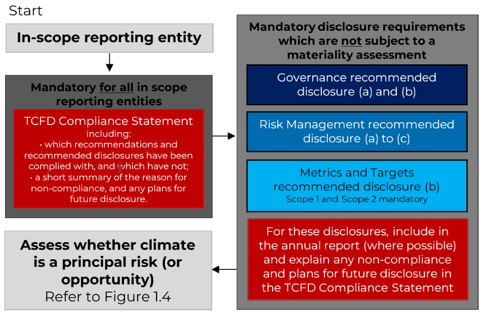 Where an entity is subject to legislation or regulation relating to climate-related disclosures or similar, they shall follow the related requirements in full. This can be summarised as follows:
