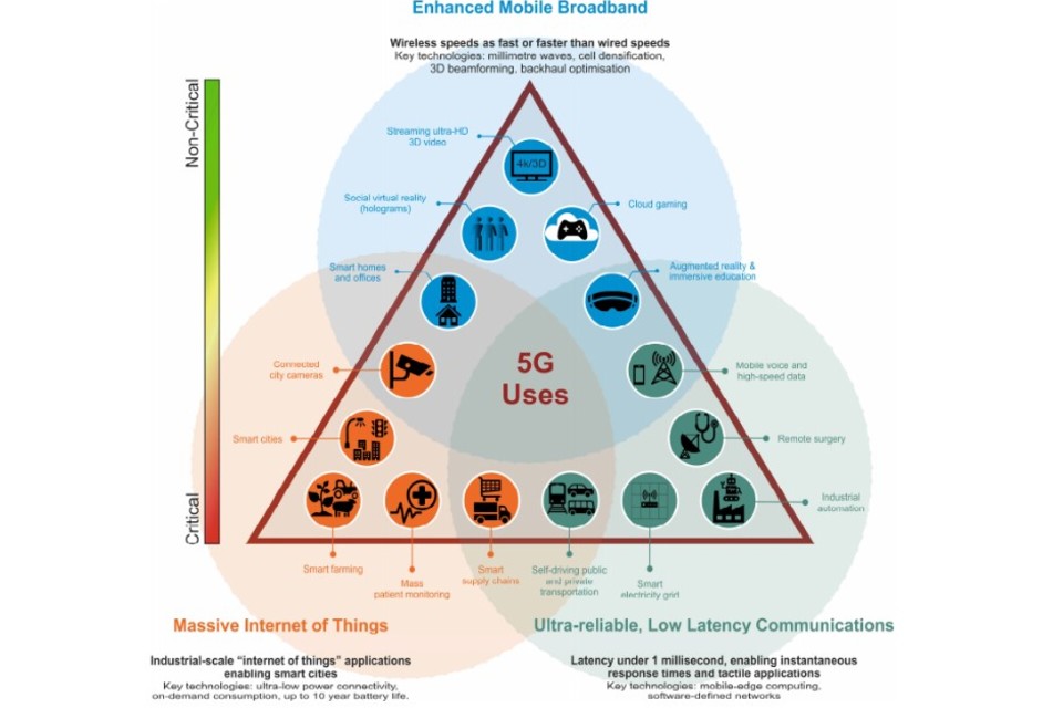 The following diagram features a selection of key uses of 5G technology arranged in a triangular diagram and arranged into three groups. Enhanced Mobile Broadband is classified as non-critical at the peak of the triangle, while Massive Internet of Things and Ultra-reliable, Low Latency Communications are considered critical and are arranged at the bottom of the diagram.