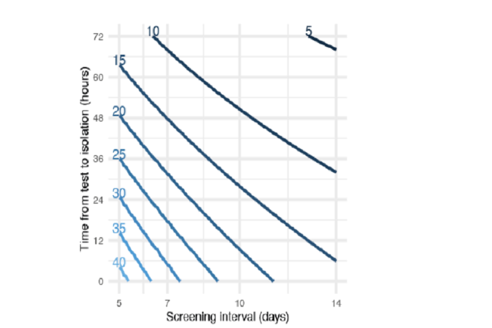 Figure 1 shows the reduction in transmission of infection from a target group (which could be a high-risk group e.g. health care workers) achieved by testing with different frequency and time until return of test results.