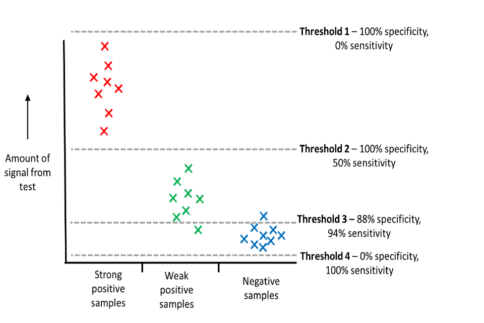 The performance of tests is described by their sensitivity (their probability of detecting a true positive, such as a sample taken from an infected person), and their specificity (their probability of detecting a true negative, such as a sample taken from a healthy, uninfected person). The sensitivity and specificity of a test are influenced by both the test technology, and the detection threshold chosen (often referred to as the ‘limit of detection’). Figure 2 shows a simplified example.