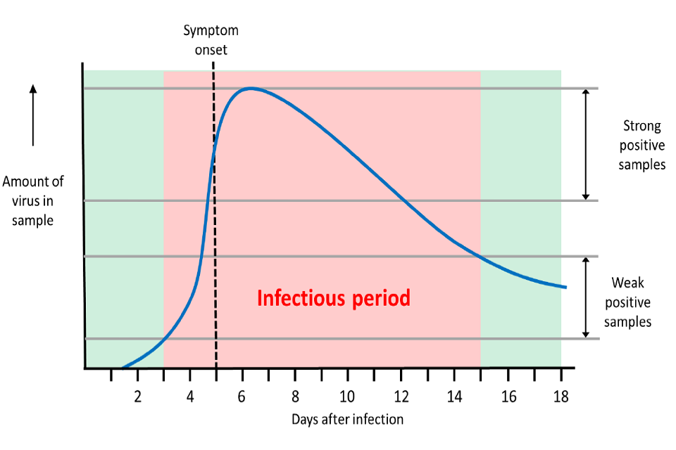 A nasopharyngeal swab sample taken from someone who has very recently been infected by SARS-CoV-2 will not yet contain any virus. Over time, as the virus replicates, the amount of virus in their swab samples will increase. It peaks a few days after the onset of symptoms, and decreases as the person recovers. The virus is often detected for several weeks after the person stops showing symptoms, while their body clears the remaining virus. This does not always mean the person is still infectious. An idealised, illustrative example of the amount of virus in samples is shown in Figure 1. If the person is sampled early during infection the swabs will be weak positive samples, as they contain very little virus. At the onset of symptoms they will be strong positive samples, as they contain a large amount of virus.