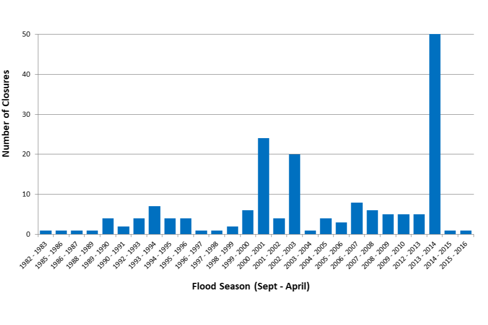 During the winter of 2013 to 2014 the Thames Barrier was used more frequently than in previous years due to the particularly high river flows that occurred during that winter. It is too early to identify whether or not this is part of an emerging longer term trend but we are able to conclude that it is not part of an existing trend.