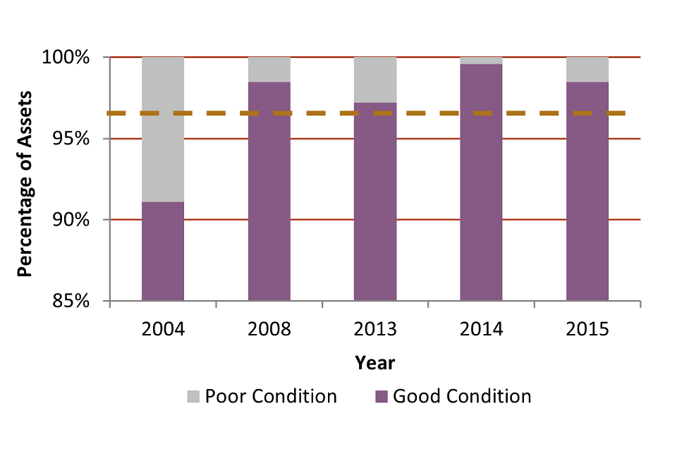 98% of the assets in the estuary are currently in fair or good condition (Figure 2). This exceeds our target but is lower than 2014, when 99% of assets were in fair or good condition. In the future this target will be rising to 98%. Current asset condition in the estuary already meets this higher target.