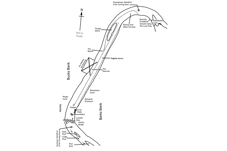 The navigation channel will be on the Remenham, left side of the river, along the Henley Royal Regatta course.