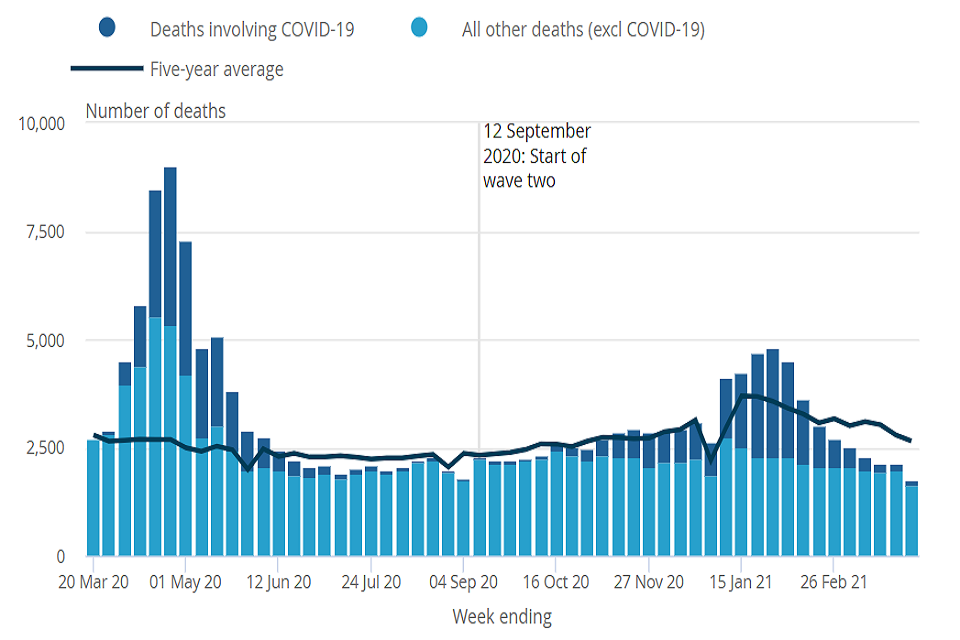 Figure 2: number of weekly deaths of care home residents registered from 14 March 2020 to 2 April 2021, England and Wales[footnote 5]
