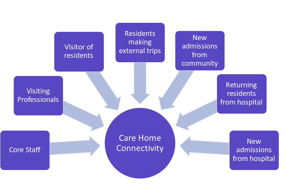 Any person going into a care home could introduce COVID-19 to the care home. The main groups of people crossing the threshold of care homes, shown in figure 1, are listed below in terms of frequency of contact with residents:
