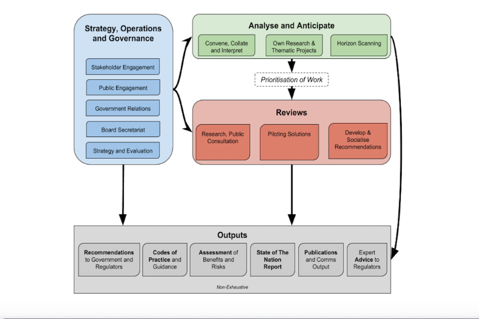 Aims: Convene different communities and expertise to provide an overview of current and emerging opportunities and risks from data-driven technology across government, society and the economy, informing government, stakeholders, the public and the CDEI’s own understanding and work. This function will also review the existing regulatory and governance frameworks to identify gaps in response to data-driven technology and barriers to responsible innovation.