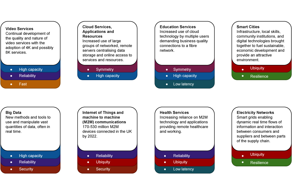To support this demand, the UK needs infrastructure that is high capacity, reliable, resilient, secure, affordable and fast. Over the next decade we can expect the emergence of completely new services, applications and devices currently not conceived of but which will create additional demands on future networks. The diagram below summarises currently anticipated growth areas and their key demands of infrastructure.