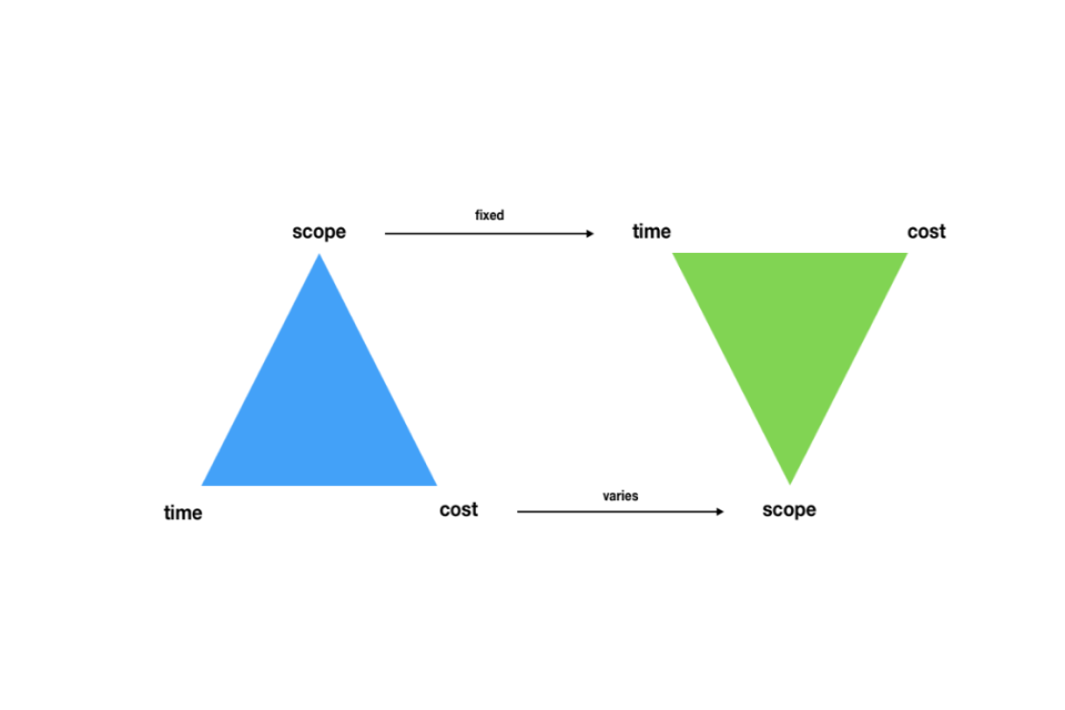 2.5. The Iron Triangle diagram, below, illustrates that, in a traditional (waterfall) project, there is very often a mindset that the desired scope must be delivered. The consequence of pursuing this is that time and cost can vary. This means projects can run overtime and over budget boundaries. Agile delivery, however, acknowledges the uncertainty as to what can be achieved and constrains the time and cost available for delivering the desired outcome(s). This means that the scope becomes the variable. It should be noted, though, that the principles on which agile is based - individuals, interactions, collaboration and responding to change - mean that this variation is known in near real-time (through sprints) rather than becoming an unwelcome surprise at the end of a lengthy delivery period.