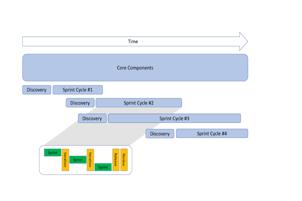 4.10. The key components within each Sprint Cycle are highlighted in the above call-out box, which is repeated for each sprint. This is a fundamental principle of agile and one of the most obvious ways in which it differs from traditional delivery methodologies. The sprint cycle is delivered collaboratively between the buyer and supplier. There are regular touch points that allow for feedback and a change in approach. Iterations of the solution are produced and assessed before a release is issued at the end of the sprint cycle. This feedback loop is incorporated both within the sprint cycle and in support of planning for future sprint cycles (discovery). It is through this mechanism that progress is monitored and the backlog is re-prioritised - if necessary - based on learnings of what works and what does not in producing the intended outcomes for the product.