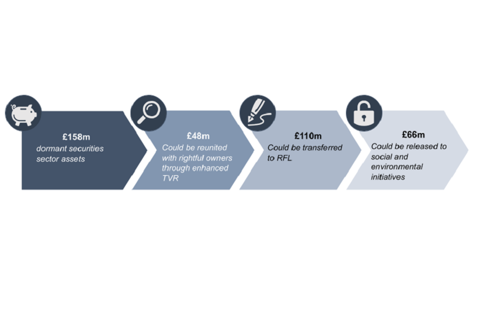 Infographic showing how the securities sector could contribute to the expanded Scheme: £158m dormant securities sector assets; £48m Could be reunited with rightful owners through enhanced TVR; £110m Could be transferred to RFL; £66m Could be released to social and environmental initiatives