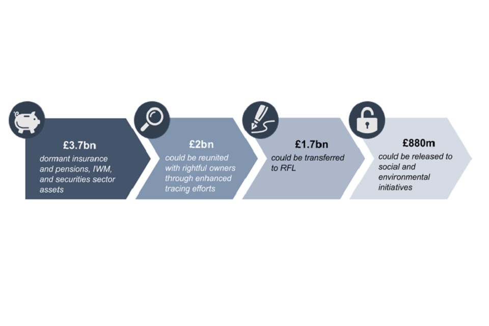 Infographic showing how money would be made available through the expanded Scheme: £3.7bn dormant insurance and pensions, IWM, and securities sector assets; £2bn could be reunited with rightful owners through enhanced tracing efforts; £1.7bn could be transferred to RFL; £880m could be released to social and environmental initiatives