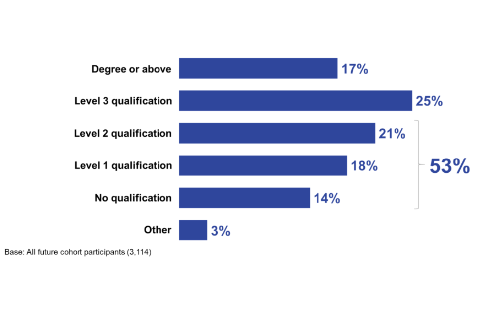 Many of the future cohort are in stable employment: 4 in 10 (41%) have been in their current job for over 5 years, and a similar proportion (42%) have been in their role for between one and 5 years. Respondents with no qualifications are more likely to have been in the same job for more than 5 years (48%). Three-quarters of future cohort respondents (77%) have a permanent contract compared to 16% on a zero-hours contract and 4% on a temporary/fixed term or seasonal contract.