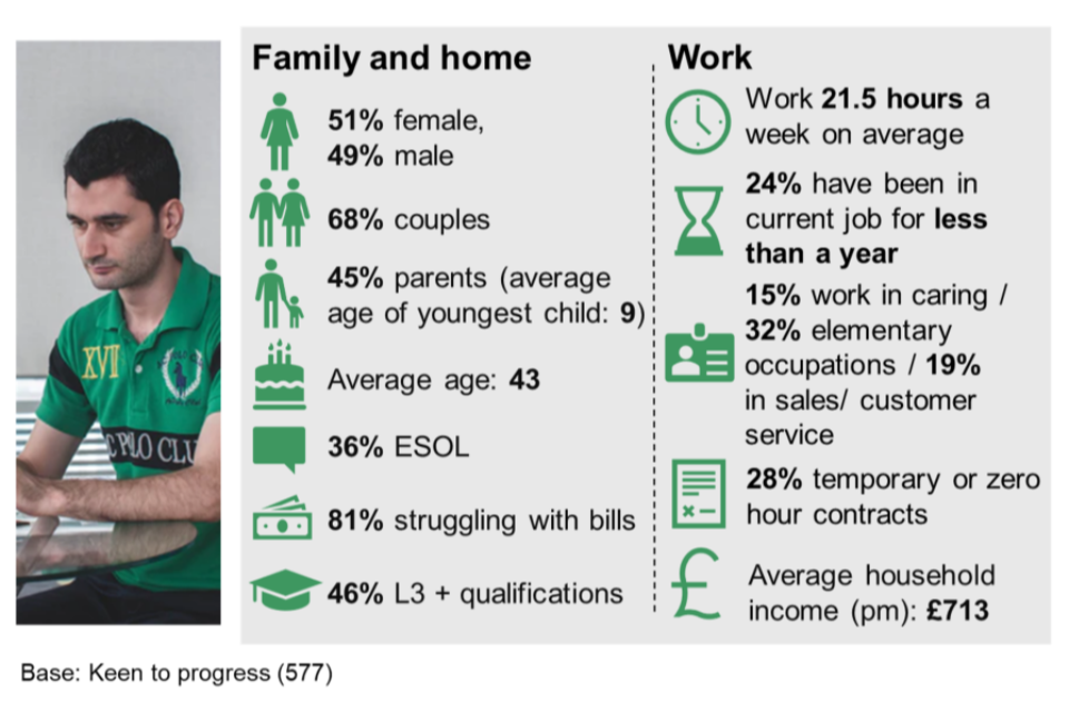 - to assess awareness of/reaction to in-work support and conditionality and understand how this might influence behaviour around progression