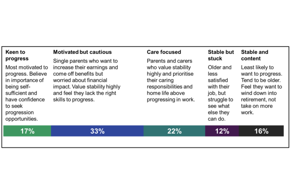 The segmentation analysis produced 5 discrete groups of the future cohort claimants, based on their attitudes and behaviour with respect to in-work progression. The 5 groups and their prevalence are: ‘Keen to progress’ (17%), ‘Motivated but cautious’ (33%), ‘Care focused’ (22%), ‘Stable but stuck’ (12%) and ‘Stable and content’ (16%).