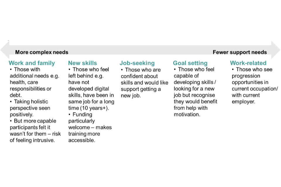 The qualitative research found that the type of intervention which best suited participants depended on their needs, current work status and attitudes towards progression. Participants with more complex needs such as health, debt or family circumstances were most open to holistic support including funding for childcare or debt. Those with lower existing skills felt that JCP was an appropriate provider, but those with higher skills or qualifications were more reluctant to visit a JCP and preferred a private employment agency or accredited training provider. Participants who were happy in their job and could see progression opportunities with their current employer preferred to get training in this way.