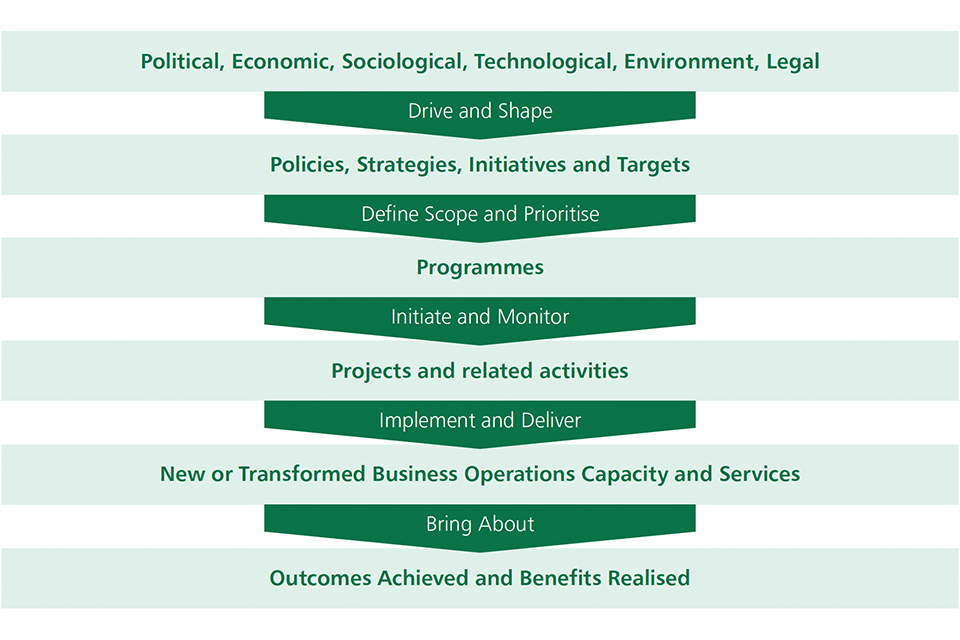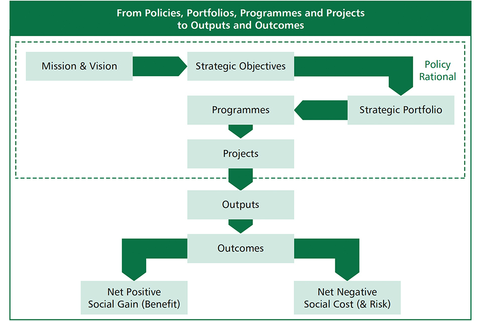 In government as in many large private sector organisations, major changes involve a sequence of decisions at several levels. Typically, organisations will have their high level purpose expressed in some form of mission statement and may even talk about their intentions in terms of a vision. To make these rather high level statements into implementable programmes and projects, there needs to be another level of more specific strategic policy objectives. Realisation of these strategic objectives requires the organisation and planning of programmes and projects which are best managed in related strategic portfolios. Policies provide direction and high level objectives, these enduring parameters drive and direct the required changes the organisation is working to bring about. The definitions of key terms used in this guidance are given in Box 3.