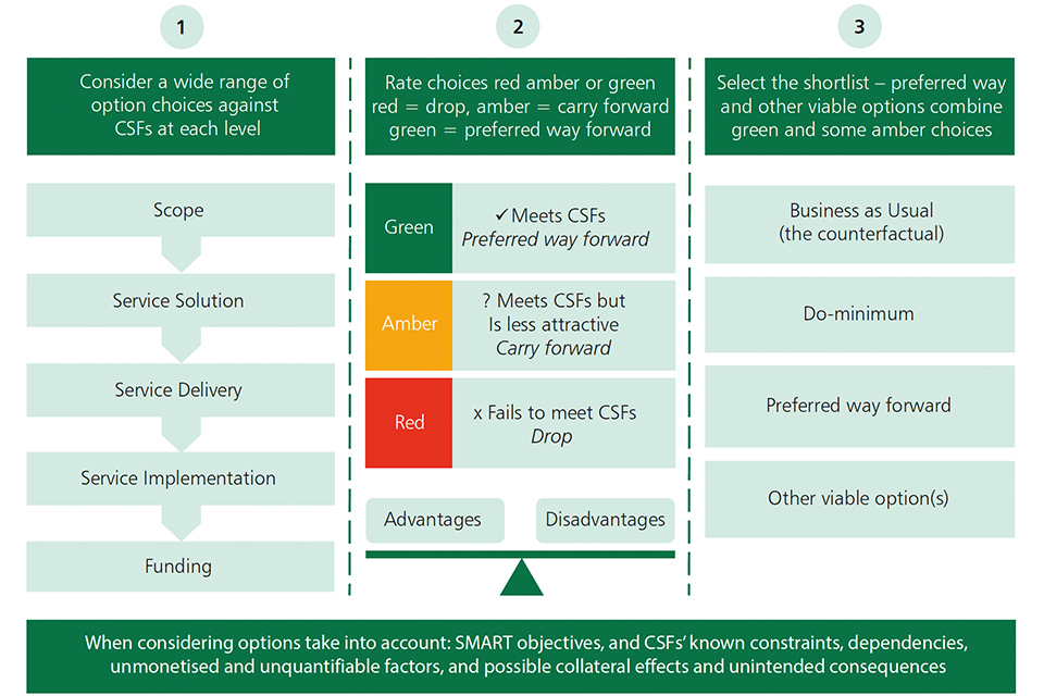 Longlist analysis using the options framework filter considers how best to achieve the SMART objectives. Alternative options are viewed through the lens of public service provision to avoid bias towards preconceived solutions that have not been rigorously tested. A wide range of possibilities are considered, and a viable shortlist is selected including a preferred way forward. These are carried forward for further detailed appraisal. This process is where all complex issues are taken into account and is the key to development of optimum Value for Money proposals likely to deliver reasonably close to expectations.