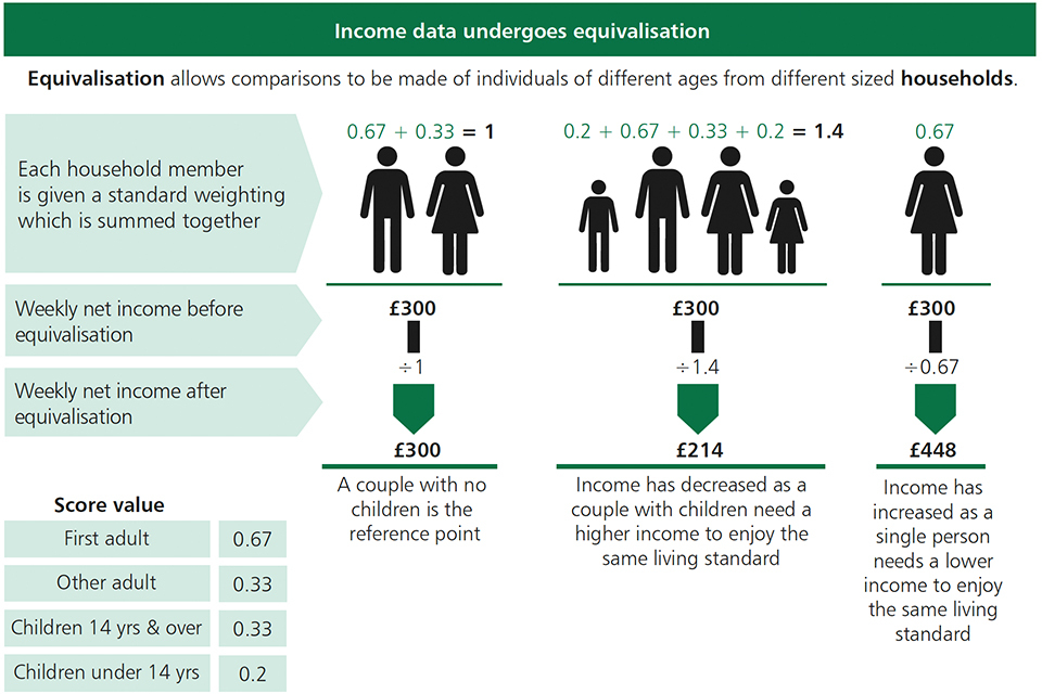With median equivalised income per week for the bottom and middle quintile, respectively £244 and £481. ↩