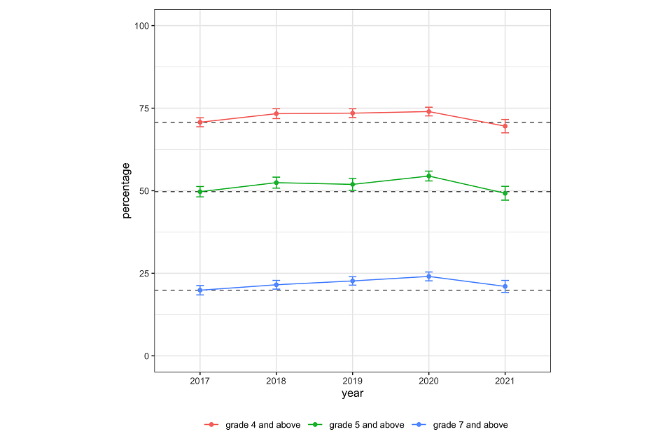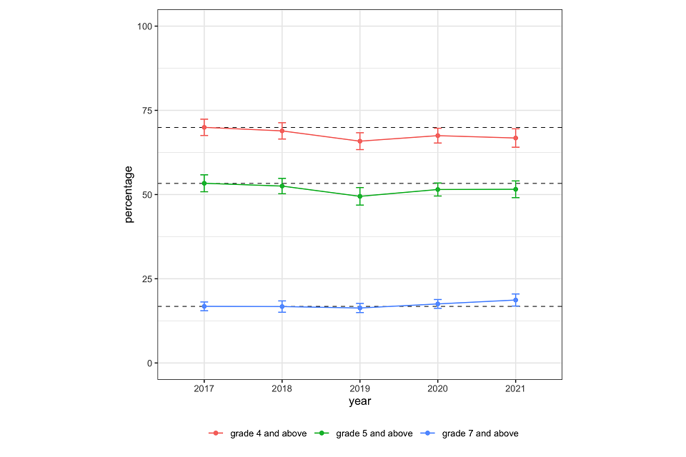 Figure 4.1 presents 95% confidence intervals around the percentages achieving at least the specified grade boundary in 2021, as compared with previous years and the 2017 population baseline percentages. The 2017 population percentages are represented as dotted lines and the trend lines across years as solid lines. This format has been used to encourage the reader to compare the point estimate confidence bands for each year with the 2017 baseline population percentages, bearing in mind the confidence intervals.