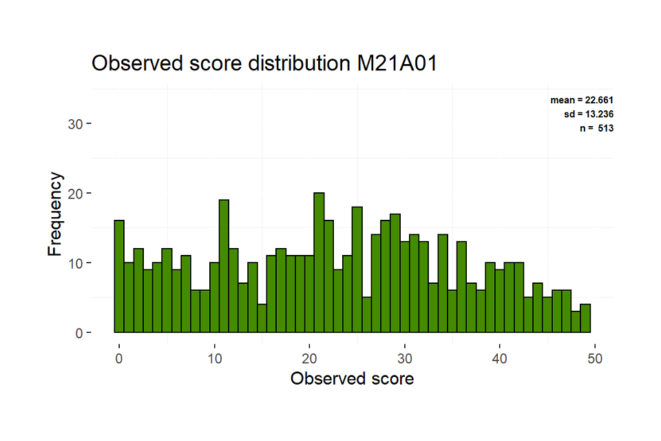 In addition, a full item analysis was carried out for each test, in which the difficulty of every question and its discrimination were calculated. These indicated that all the questions had functioned either well or, in a small number of cases, adequately and there was no need to remove any items from the analyses. Therefore, all were retained for the IRT analyses. Additionally, an analysis was conducted to establish if any items had performed markedly differently in 2021 compared with the previous years. Where there are such indications, a formal procedure is followed for reviewing the items to establish whether there could be an external reason for the change. In 2021, no items were removed from the link.