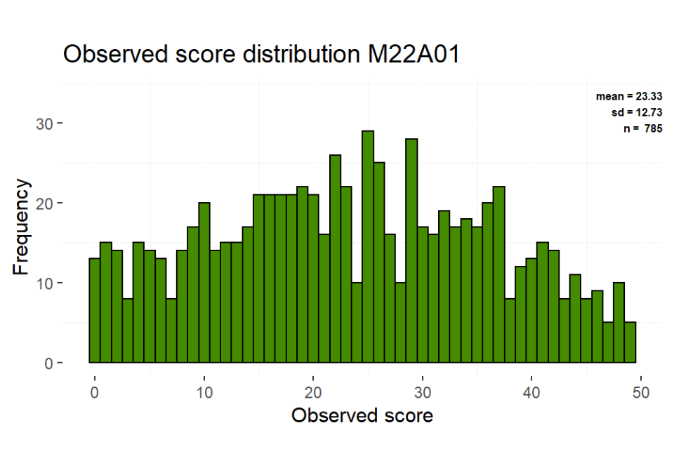 In addition, a full item analysis was carried out for each test, in which the difficulty of every question and its discrimination were calculated. These indicated that all the questions had functioned either well or, in a small number of cases, adequately. Therefore all items were retained for the IRT analyses. Additionally, an analysis was conducted to establish if any items had performed markedly differently in 2022 compared with the previous years. Where there are such indications, a formal procedure is followed for reviewing the items to establish whether there could be an external reason for the change and if there is sufficient evidence to remove the item from the link between years. It should be noted that in 2022 the names of characters in four of the items were changed to more ethnically diverse names in order to improve the diversity of the characters referenced in each booklet and across the whole maths NRT. These four items did not function any differently and therefore were treated as common items. In 2022, no items were removed from the link. There was also no evidence from the DIF analysis that the adaptations introduced for GCSE maths exams this summer (i.e. advance information and the provision of formulae sheets) had an impact on performance on the NRT items. This is not unexpected given that advance information was released close to the NRT taking place.