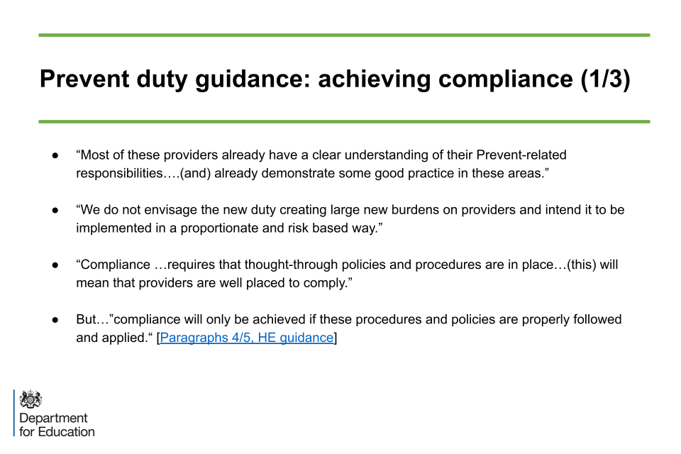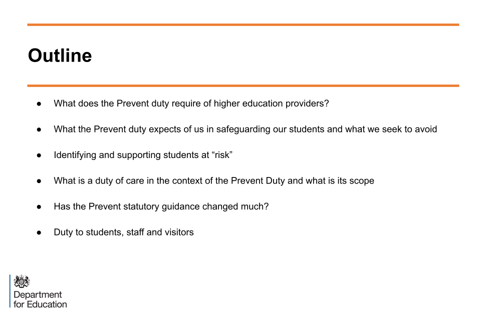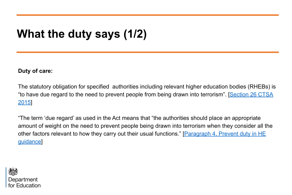 This explains to the audience the specific nature of requirements of the Prevent Statutory Duty that is placed upon providers in the Counter-Terrorism and Security Act (2015) (as amended). There is specific statutory guidance regarding the Duty for higher education and that came into force on 18 September 2015.