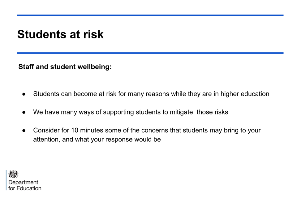 This slide asks the audience to consider the variety of ways in which students may become at risk during their journey in higher education and how they might be supported.