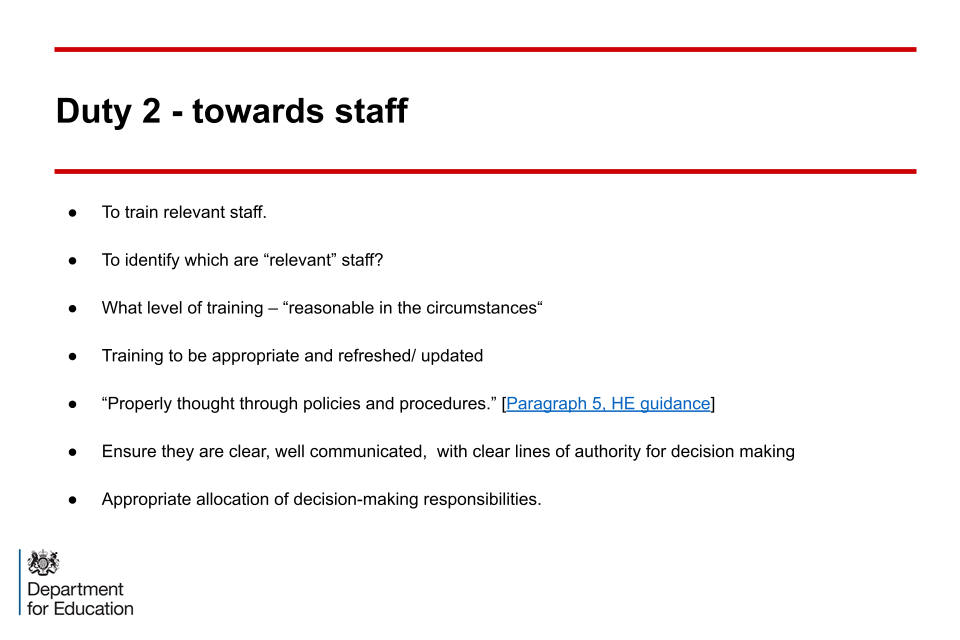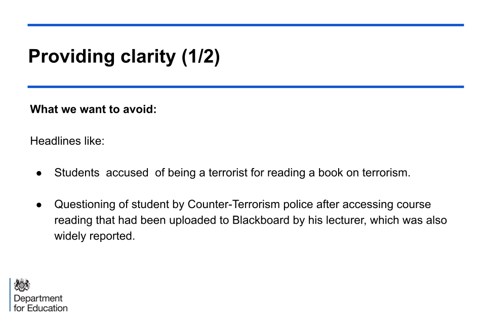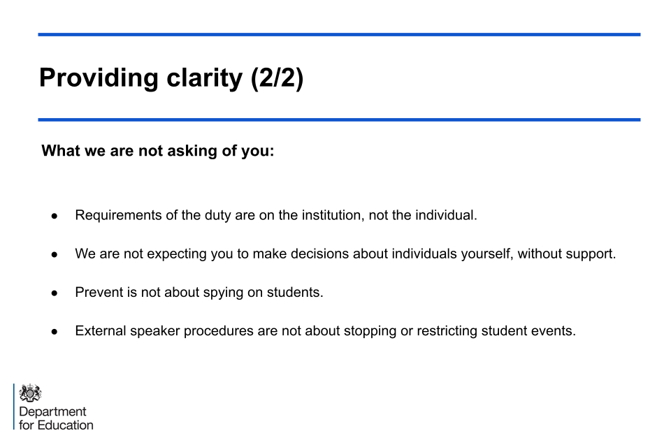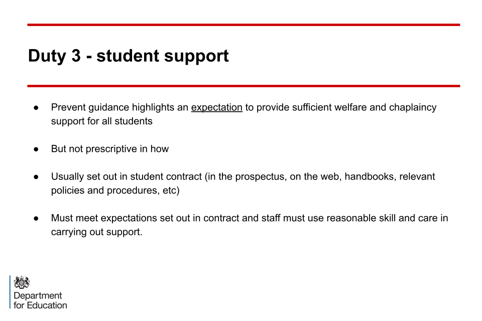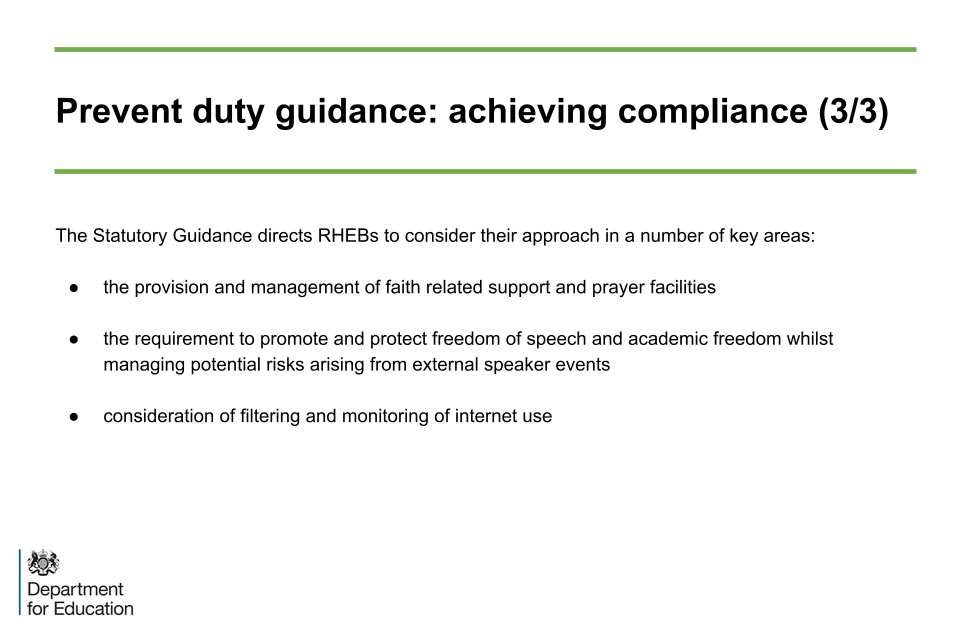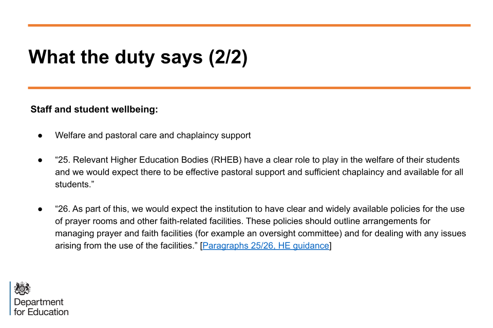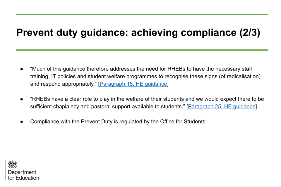 These slides highlight quotes from the statutory guidance which demonstrate some specific requirements and areas that should be considered by RHEBs for them to be compliant with the Duty. The slides also clarify that compliance in this respect is judged by the Office for Students (OfS).