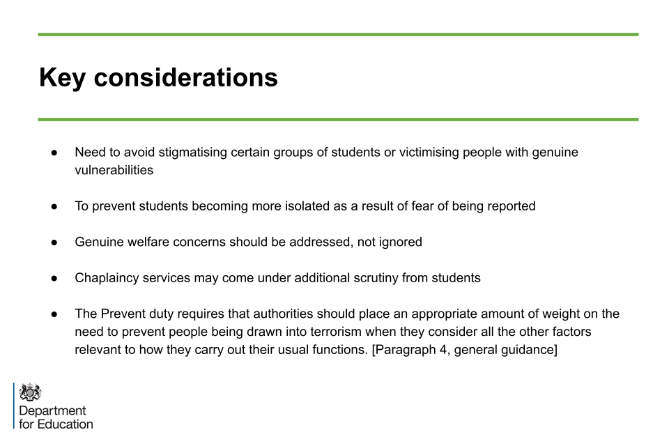 However, even this remote possibility reinforces the requirement for policies on student welfare and arrangements for supporting students who are a cause for concern to incorporate reference to the Prevent Duty, and that staff are aware of the procedures and trained to know what to do where someone appears to be vulnerable to being drawn into terrorism.