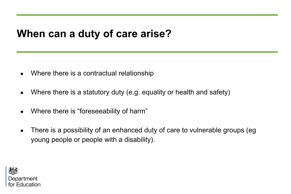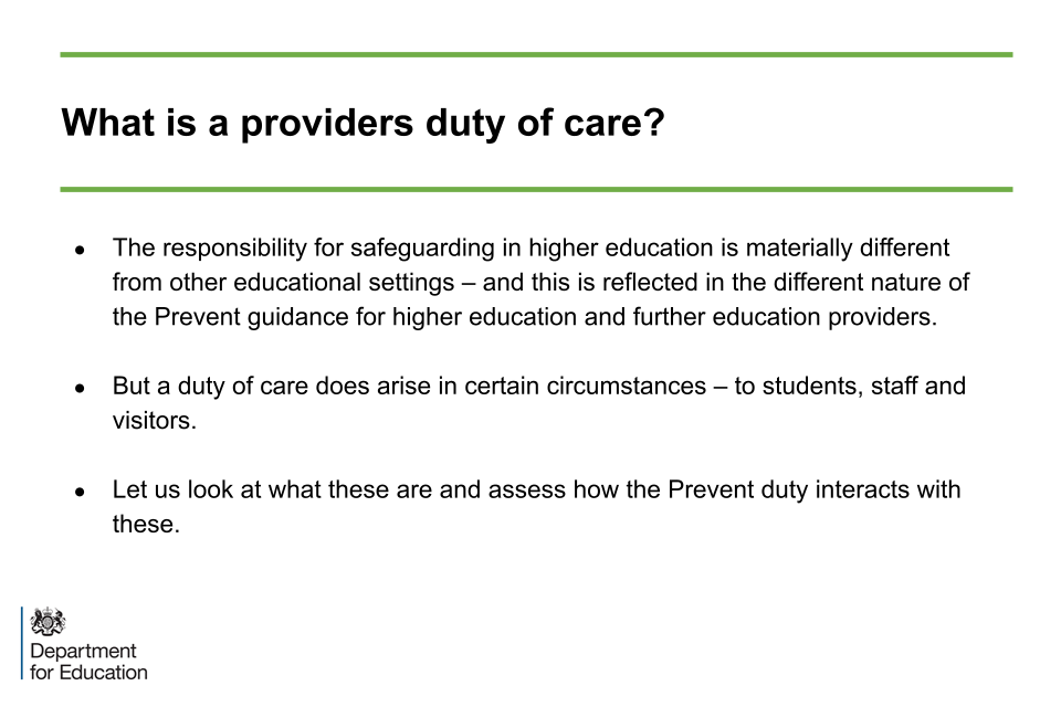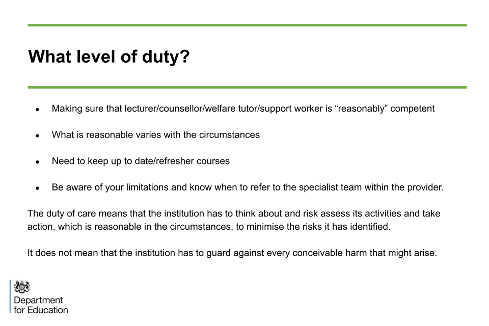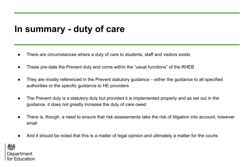 This is important. A duty of care does not mean that a provider has to guard against every conceivable harm that might arise. It does mean that a provider has to think about and risk assess its activities. It then needs to take action which is reasonable in the circumstances. This resonates with the requirement for risk assessment and action planning in implementing the Prevent Duty.