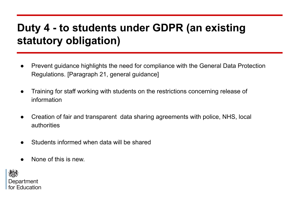 The need for compliance with General Data Protection Regulations (GDPR) is referenced in the Prevent statutory guidance – RHEBs must ensure that their arrangements to implement Prevent are consistent with their procedures for compliance with data protection legislation.