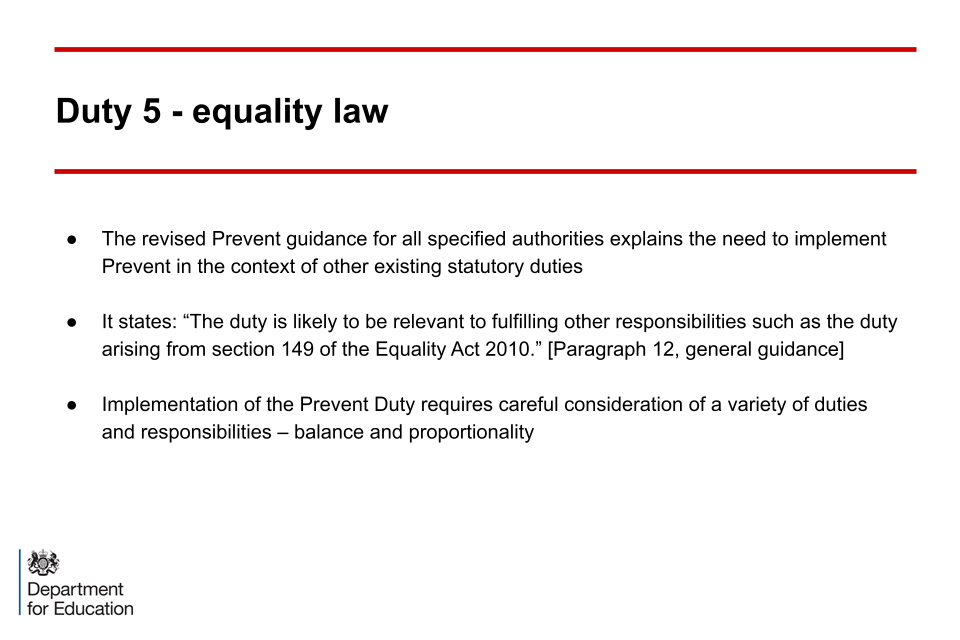 All specified authorities must be mindful in implementing the Prevent Duty of their existing duties to comply with equality legislation and in particular the Equality Act (2010) (as amended) – for publicly funded providers this includes the public duty to promote equality – for private providers the other requirements relating to non-discrimination, harassment, victimisation etc.