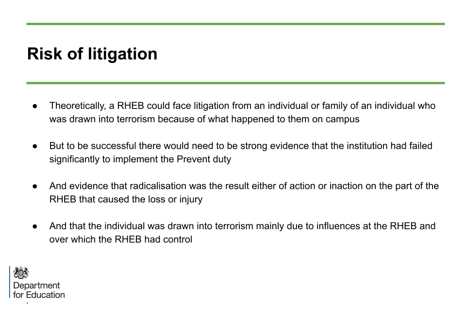 The slide acknowledges that there is a theoretical risk of litigation should someone be drawn into terrorism because of something that is claimed to have happened on campus. But the risk is low – however, the risk would be greater if it were shown that the institution had failed significantly to implement the Duty.