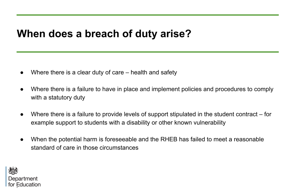 Firstly, where there is a contract in place and where in the student contract the RHEB promises levels of support, reasonable adjustments, counselling provision, etc, a duty of care arises. If the university fails to provide that level of care, which can then be shown to lead to injury, it may face claims in negligence.