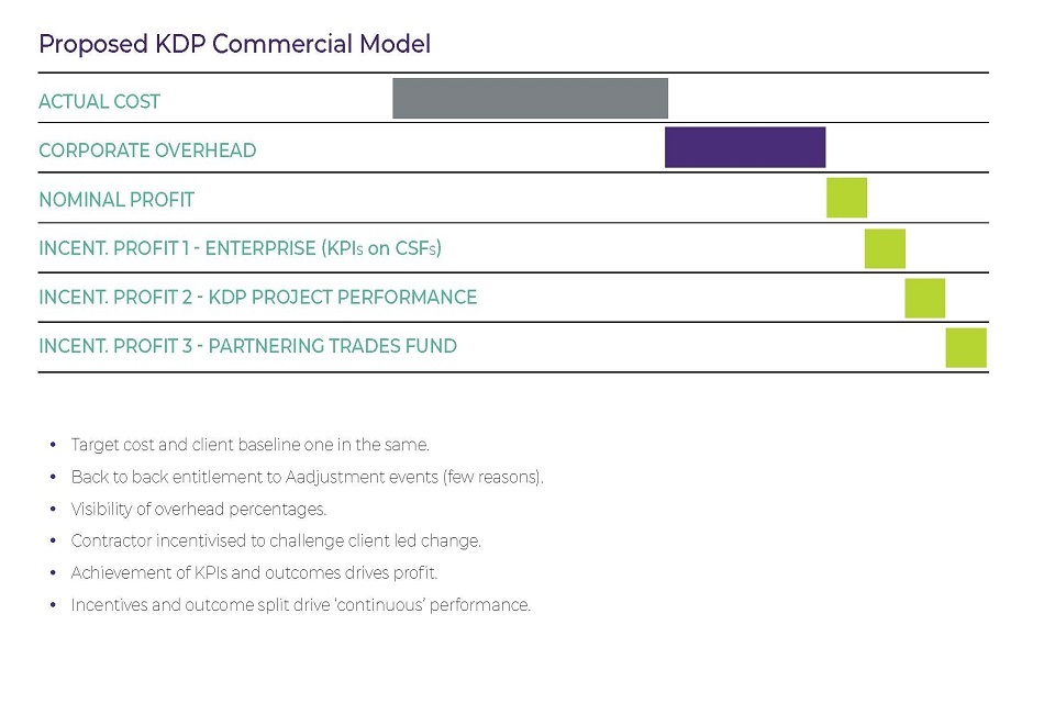 The model aims to drive a change in culture, increased collaboration and fundamentally (including through early contractor involvement) mitigate potential changes before they arise; incentivise performance to the baseline and not the traditional model of contractors looking to drive up their own individual target costs.