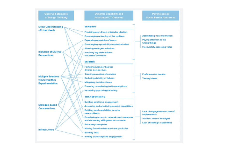 A flowchart illustrating the relationship between observed elements of design thinking, dynamic capability, associated outcomes, and psychological and social barriers addressed. Source: Liedtka, 2020.