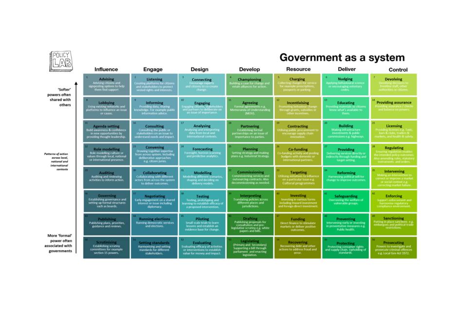 In terms of competences for design, we found frameworks which sometimes did not distinguish carefully between skills, competences and capabilities, and some which focused on specific types of design, such as user experience or service design. We examined the integration of design in government. We found that although there are academic studies that account for or critically assess how, and under what conditions, design is integrated into public service delivery, there are few examining design in policy development, and very few specific to the UK. Among frameworks and models developed by government policy labs, design teams and consultancies from the UK and internationally, there are examples of efforts to conceptualise purposes, activities and types of design in government, at different scales, and across different systems or areas of policy. Such frameworks have shifted away from linear processes towards recognising complexity and interdependencies of systems, with which design practices can play useful practical roles.