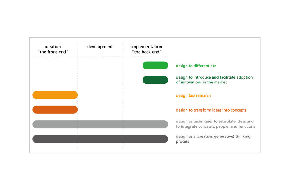 The contribution of Liedtka’s study is to show how characteristics or practices of design (seen in the left-hand column) result in dynamic capabilities in the organisation (middle column) which lead to addressing barriers to innovation (right-hand column). This is an example of a cross-cutting analysis of what the application of design thinking results in, using an existing way of conceptualising how organisations innovate. Here the outcomes associated with applying design (thinking) are structured through the three dynamic capabilities (sensing, seizing and transforming).