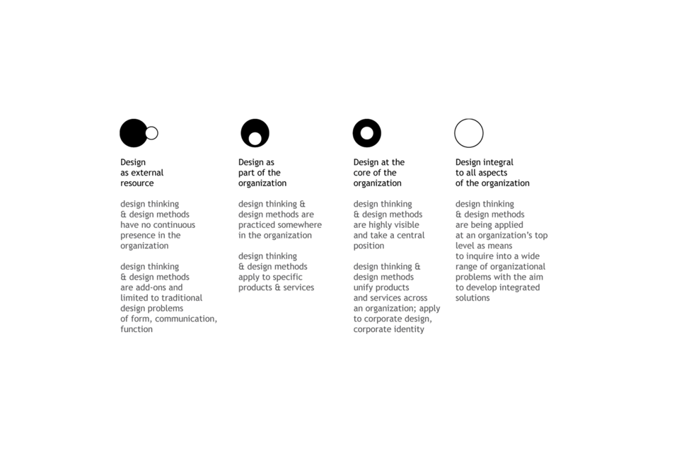 We found that maturity and enabling conditions for building and maturing design capabilities are understood as dependent on organisational ‘absorptive’ capacities or underlying taken-for-granted ‘logics’ or narratives about how things are done. Such conditions include: awareness, availability of resources and expertise, existence of narratives and leadership to provide legitimacy, and formal structures. Recent studies suggest that, rather than a simple ‘additive’ model in which design capabilities simply join existing teams, functions and skills, building up design capacity is aligned with wider narratives about innovation or agendas for doing things differently.