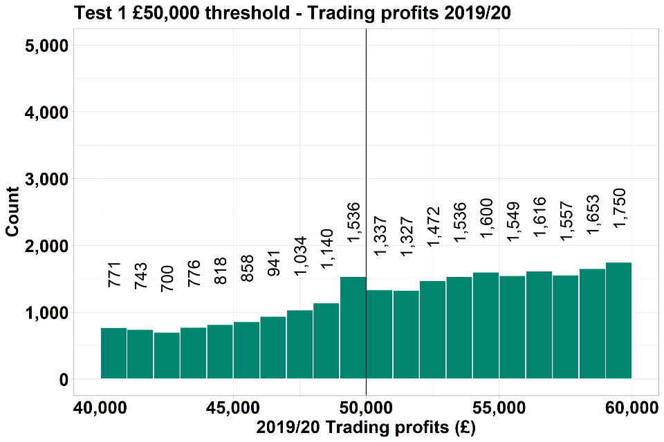 | Test 1 | Test 1 looks at individuals with trading profits in 2019 to 2020 >£0 and trading profits greater than non-trading income in 2019 to 2020 to isolate the £50,000 test | has 2019 to 2020 trading profits which are greater than or equal to £40,000 and less than or equal to £50,000 | has 2019 to 2020 trading profits which are greater than £50,000 and less than or equal to £60,000 |