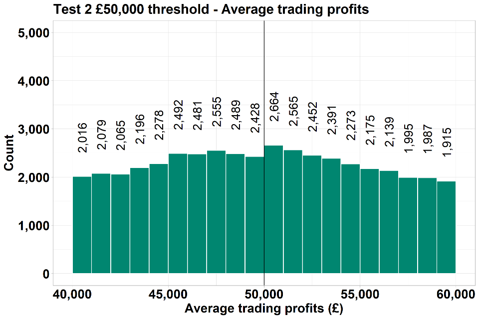 Bunching and a pre-existing discontinuity may be expected around the £50,000 threshold, particularly in test 1. This may be due to other elements of the tax and benefit system such as the higher rate income tax threshold (£50,000 in 2019 to 2020), as well as the High Income Child Benefit Charge (HICBC) which applies over £50,000. It is also possible some individuals may have anticipated the eligibility criteria for SEISS remaining unchanged for the second year. As such some individuals may have targeted their trading profits or total income to be below these thresholds.