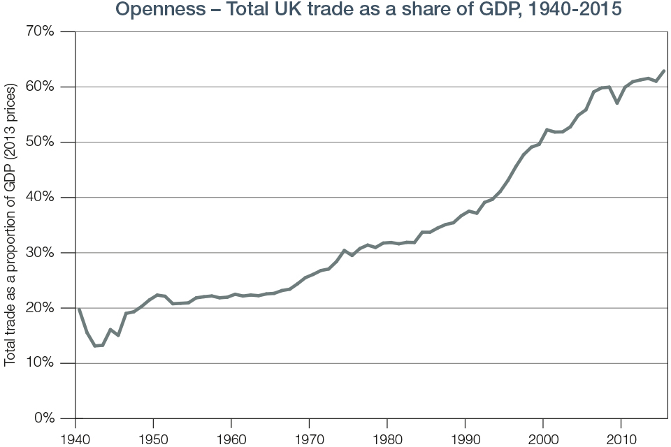 The trade-to-GDP ratio is the sum of real exports and imports divided by real GDP in 2013 reference prices. It represents the combined weight of total trade in the UK economy and is sometimes used as an indicator of ‘trade openness’; and ‘Three Centuries of Macroeconomic Data’, Bank of England, June 2016. ↩