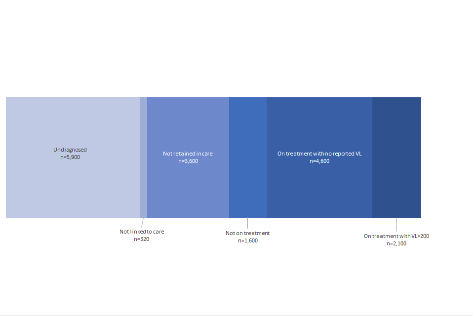 Of these 18,160 people living with transmissible levels of virus, an estimated 5,930 (CrI 4,430 to 8,710) (33%) were undiagnosed, 3,890 (21%) were diagnosed but not referred to specialist HIV care or retained in care, 1,630 (9%) attended for care but were not receiving treatment, and 2,110 people (12%) were on treatment but not virally supressed. The remaining 4,600 (25%) had attended for care but were missing evidence of viral suppression.