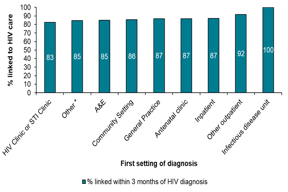 In 2019, among those living in England, 84% (3,080 out of 3,650) of adults who were newly diagnosed in 2019 were linked to specialist HIV care within 3 months, and 78% within one month. The number of individuals linked to specialist HIV care varied by first setting of diagnosis. For those linked within one month of diagnosis, by first setting, linkage was highest in those diagnosed in infectious disease units (98%) and lowest in those diagnosed in settings (75%) that included blood transfusion services, prisons, home testing, drug misuse services, self-sampling services, pharmacies, and setting/service not reported.
