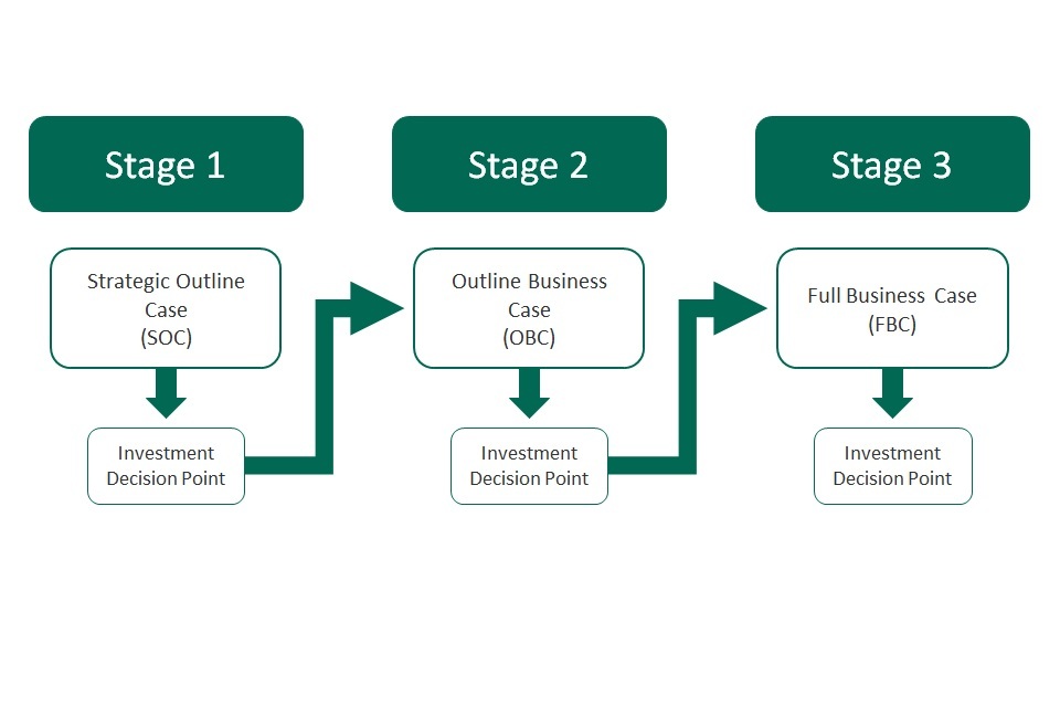 Business case process flow diagram displaying 3 process stages each with following investment decision point (IDP). Stage 1 the Strategic Outline Case, stage 2 the Outline Business Case and stage 3, the Final Business Case.