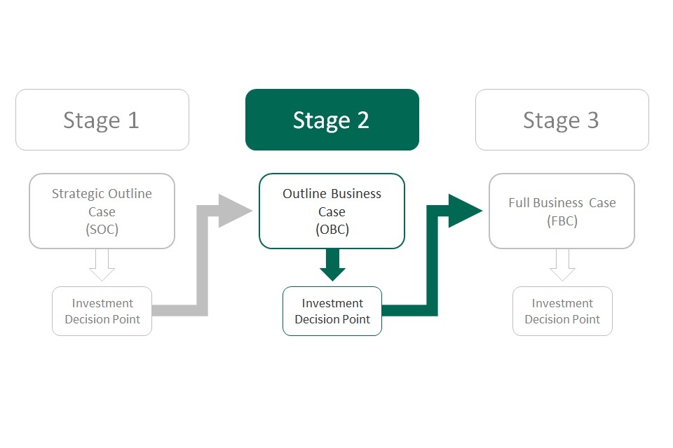 Business case process flow diagram displaying 3 process stages each with following investment decision point (IDP). Stage 2, highlighted, is the Outline Business Case followed by IDP.